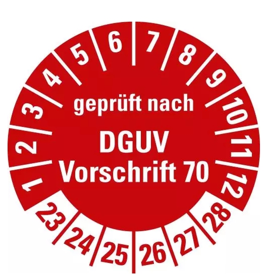 Startseite » Prüfplaketten » Prüfplaketten ab 2023 » 100x Prüfplakette „DGUV geprüft n. Vorschrift 70 | 23-28“ Etikett Aufkleber, rot | Ø 15-40 mm