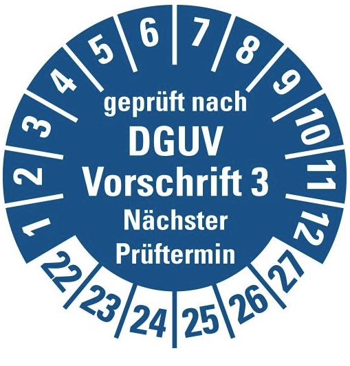 Startseite » Prüfplaketten » Prüfplaketten ab 2022 » 100x Prüfplakette „geprüft nach DGUV Vorschrift 3 | 22-27“ Etikett Aufkleber, blau | Ø 15-40 mm