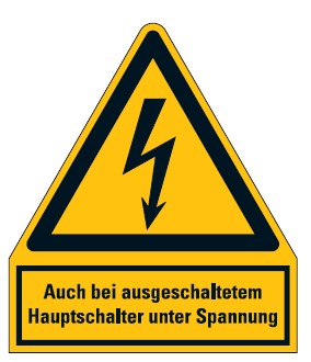 Startseite » Aufkleber / Folien / Schilder » Warnzeichen und -aufkleber » Aufkleber „Auch bei augeschaltetem Hauptschalter..“ ISO 7010, signalgelb | 21x24,5 cm