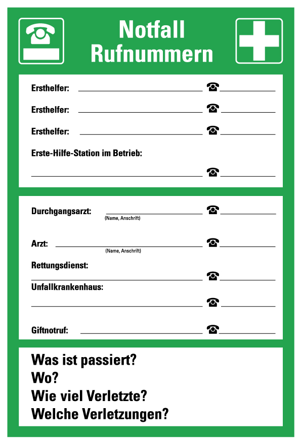 Startseite » Rettungszeichen und Fluchtwegszeichen » Aufkleber Hinweis „Notfallkennzeichnung Notfall Rufnummern“ Etikett | 20x30 cm