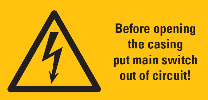 Startseite » Aufkleber / Folien / Schilder » Warnzeichen und -aufkleber » Internationale Warnzeichen/- Schilder » Warnaufkleber „Before opening the casing put main..“ | Größe wählbar